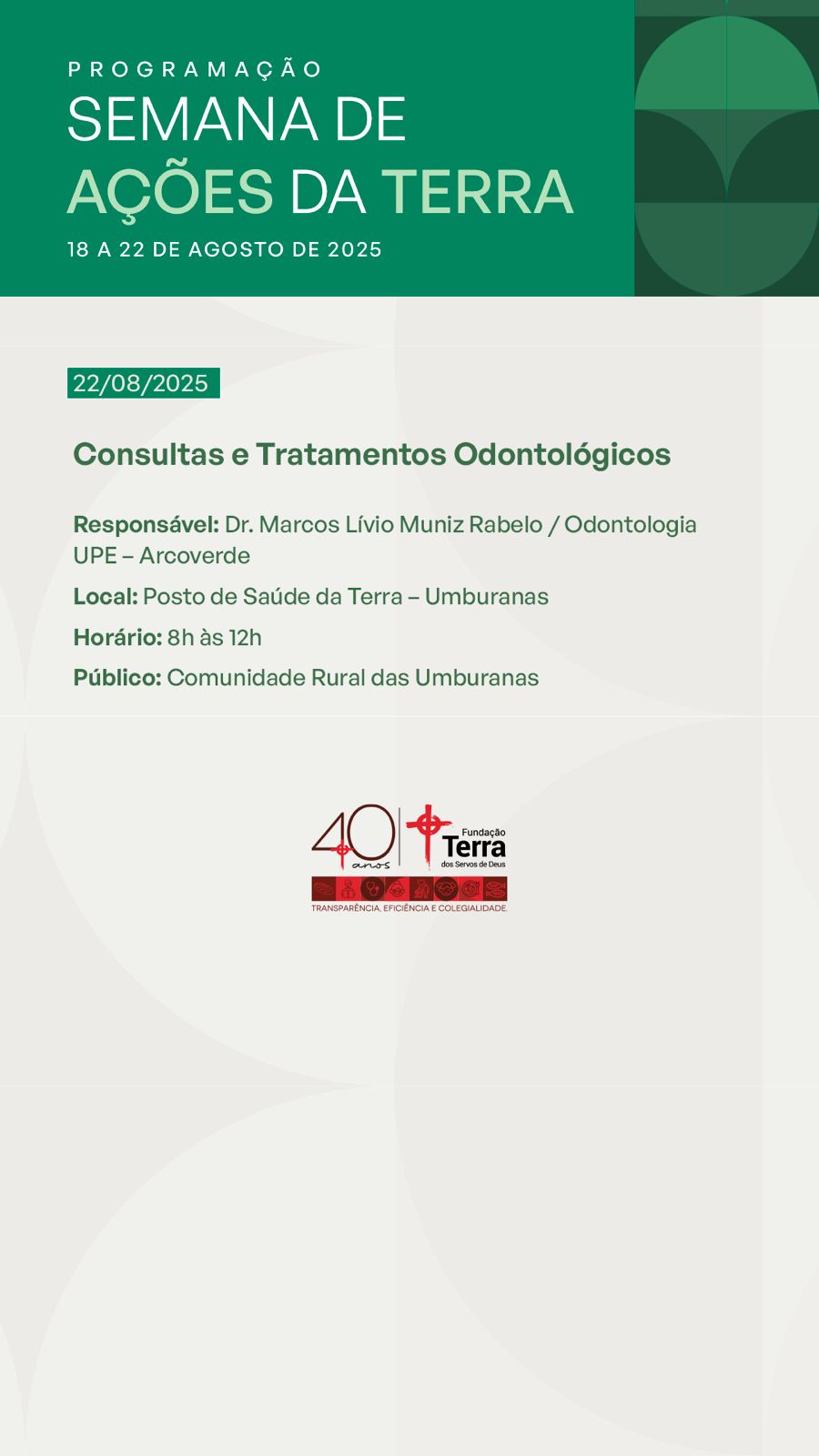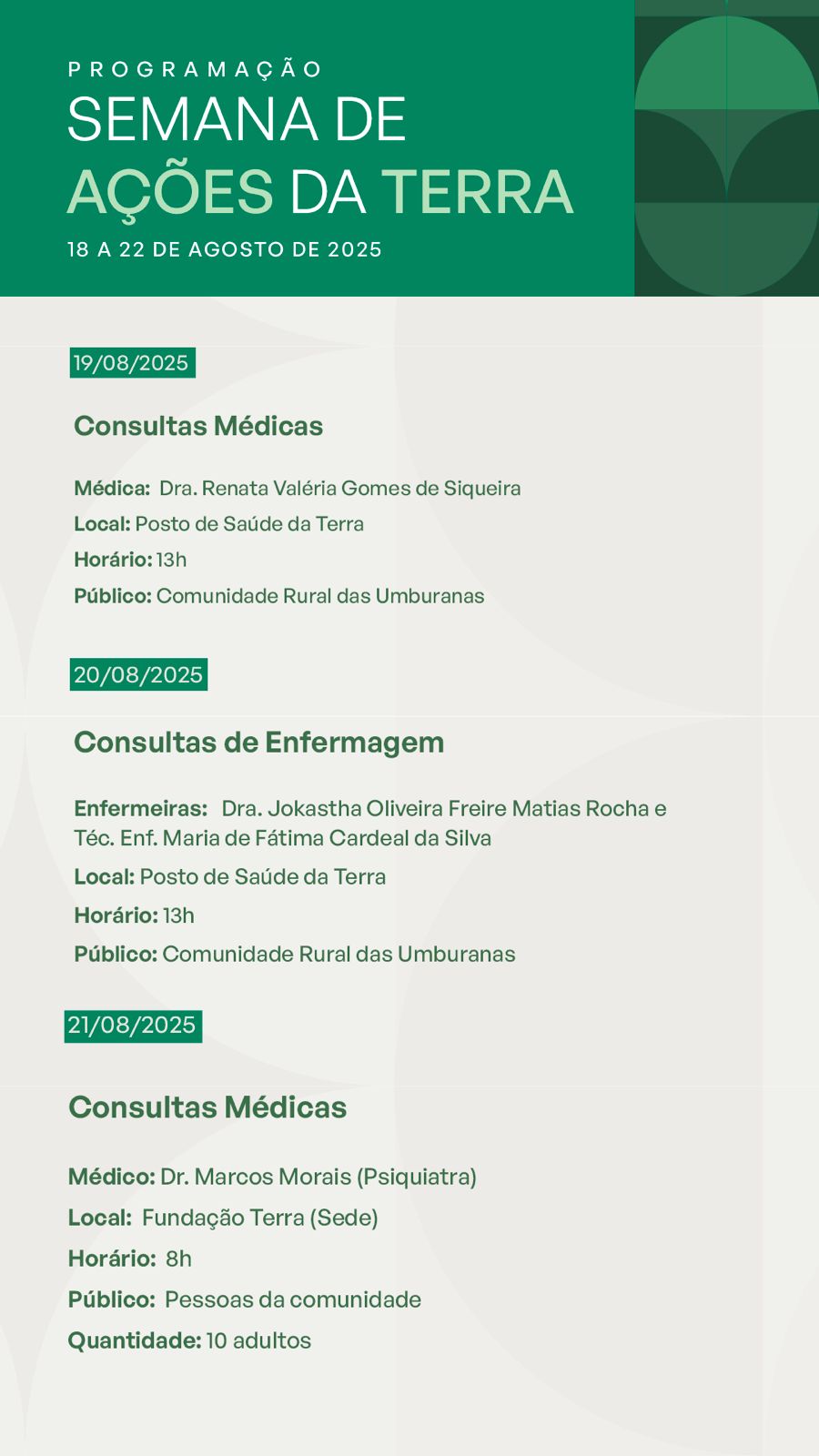 A partir da próxima segunda-feira, 18 de agosto, a Fundação Terra dará início à Semana de Ações da Terra, uma iniciativa semestral promovida pelo setor de saúde da instituição. O evento reúne uma série de atividades voltadas para a saúde e ações comunitárias, beneficiando diretamente a população atendida pela Fundação Terra.