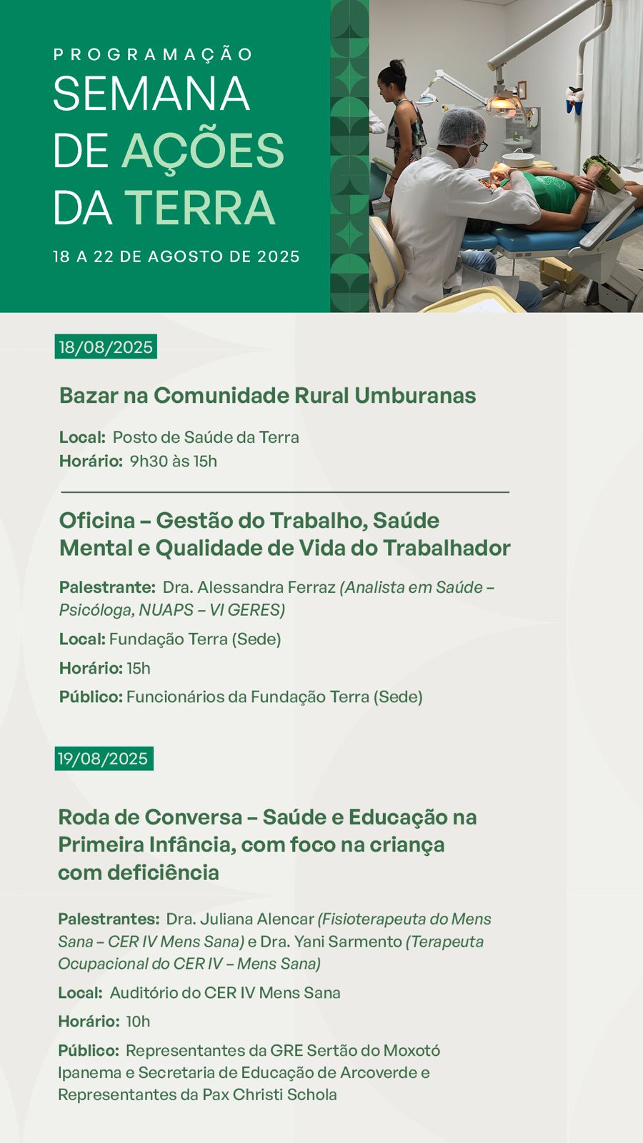 A programação, que se estenderá até a próxima sexta-feira, 22 de agosto, será realizada em três locais: na sede da Fundação Terra, em Arcoverde (PE), no Centro Especializado em Reabilitação (CER- IV) Mens Sana e no Posto de Saúde da Terra, localizado no Povoado das Umburanas, distrito de Sertânia (PE).